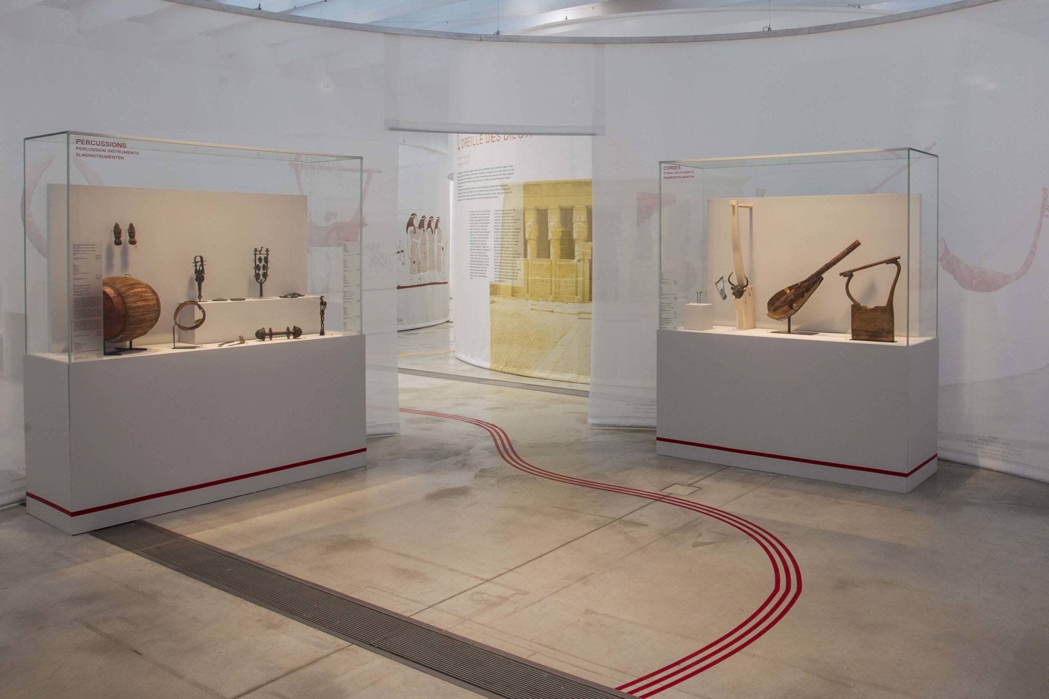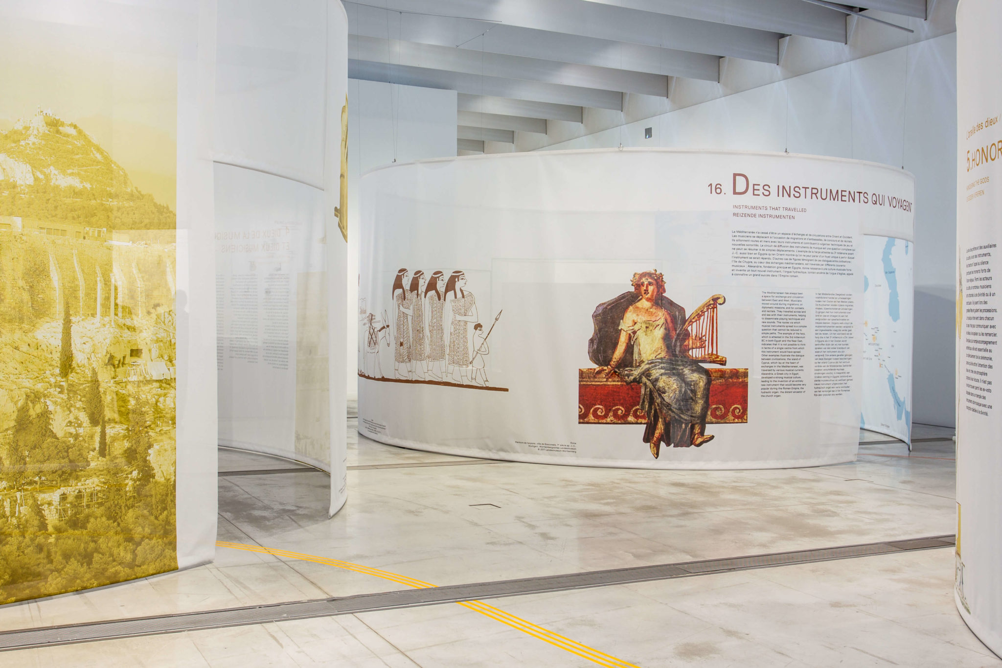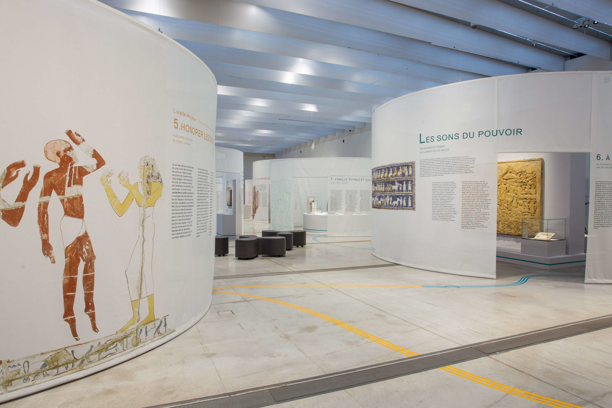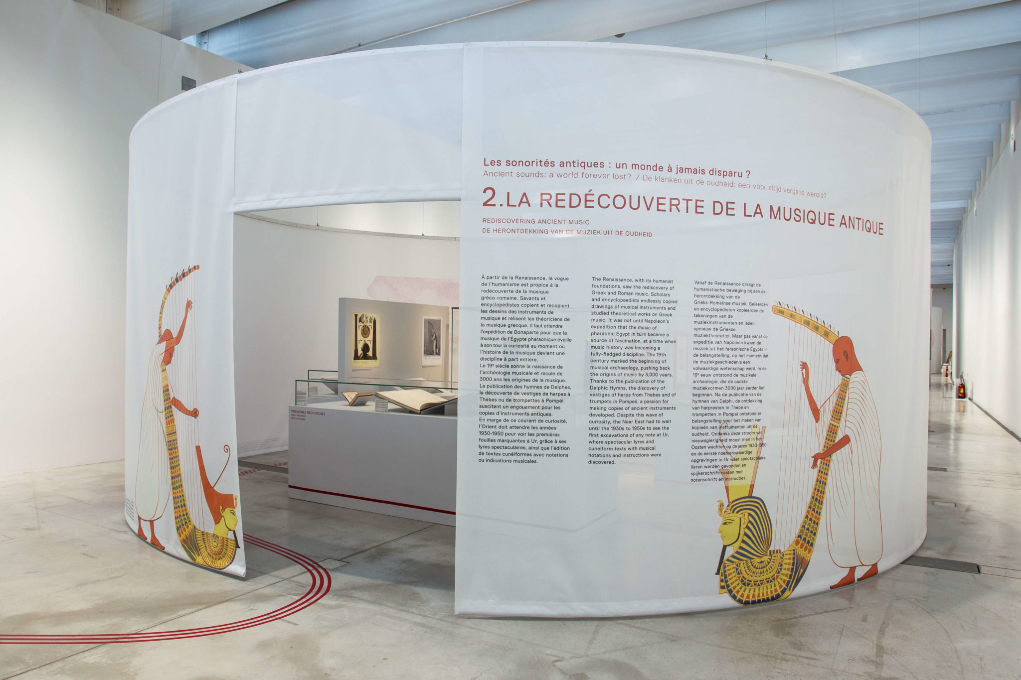 Le parcours de l’exposition intègrait également des dispositifs sonores inédits, permettant d’écouter des reconstitutions de sons d’instruments antiques ainsi que le plus ancien chant connu à ce jour dans le monde.