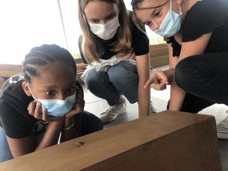 Calvin, Chloé et Léa scrutent Hypothèse de la gravité, 2021©Gunilla Lapointe